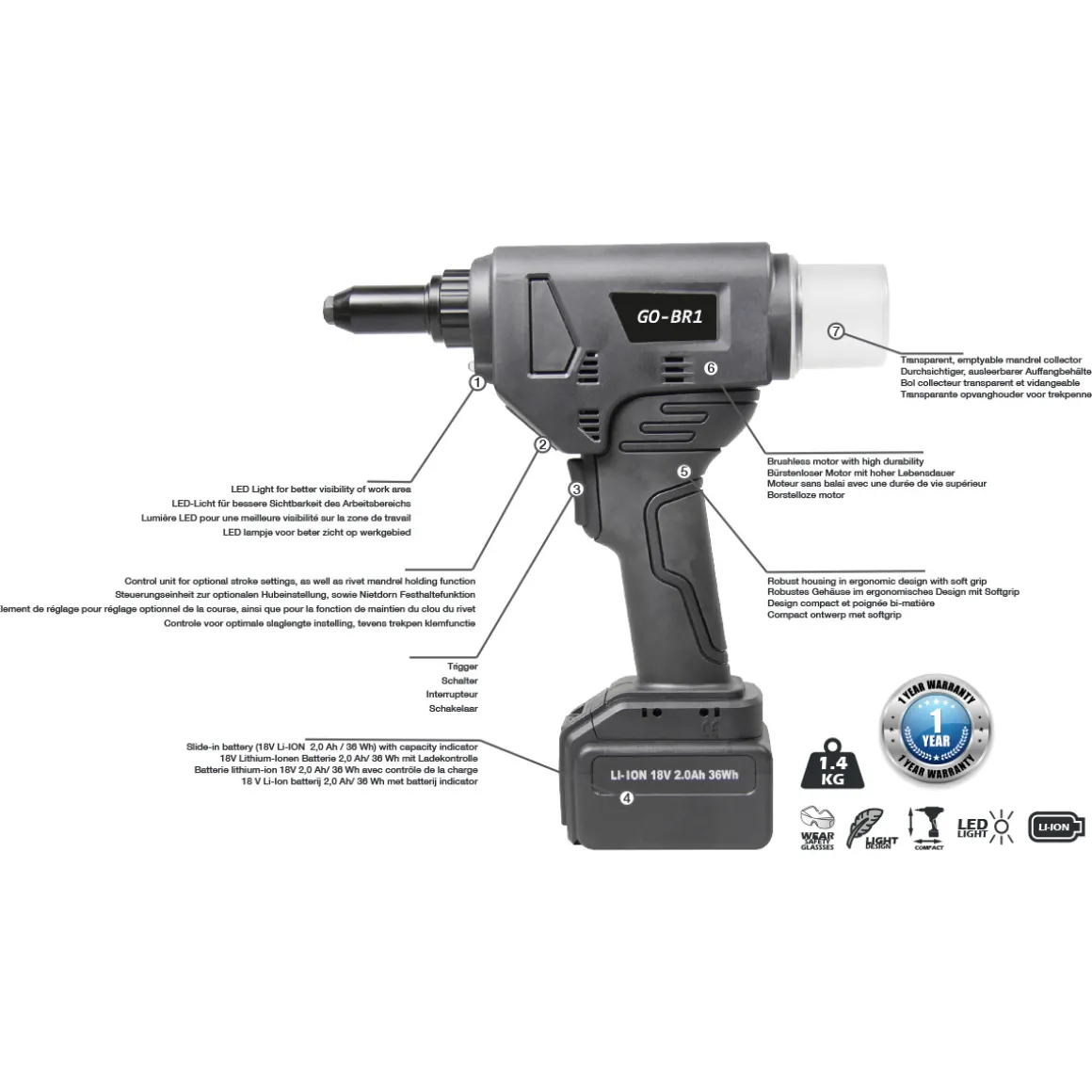Akku Nieter Blindnietgerät | Nietgerät | GO-BR1 Akku-Blindnietsetzwerkzeug mit bürstenlosem Motor 18V ohne Akku, inkl. Koffer und Zubehör Arbeitsbereich ø 3,0 – 5,0 mm alle Materialien