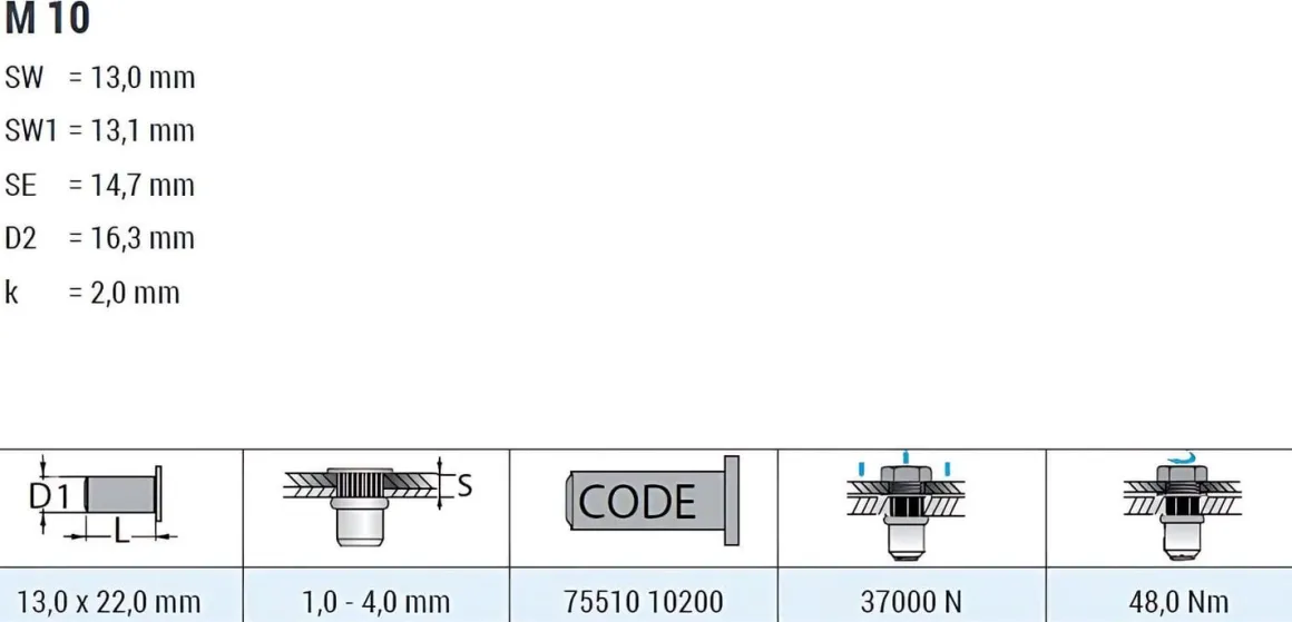 | Artikel | Blindnietmuttern BM /A2 /Fk /M10 /T6ks /Of GO–NUT Klemmbereich: 1,0 – 4,0 mm Einziehmutter Einnietmuttern |