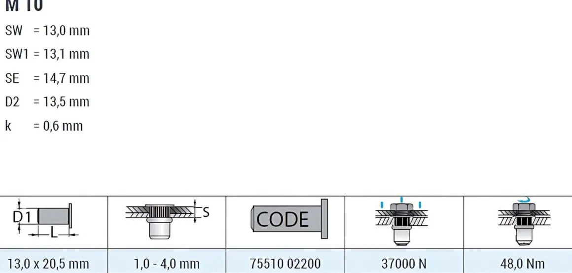| Artikel | Blindnietmuttern BM /ST /klSk /M10 /T6ks /Of GO–NUT Klemmbereich: 1,0 – 4,0 mm Einziehmutter Einnietmuttern |
