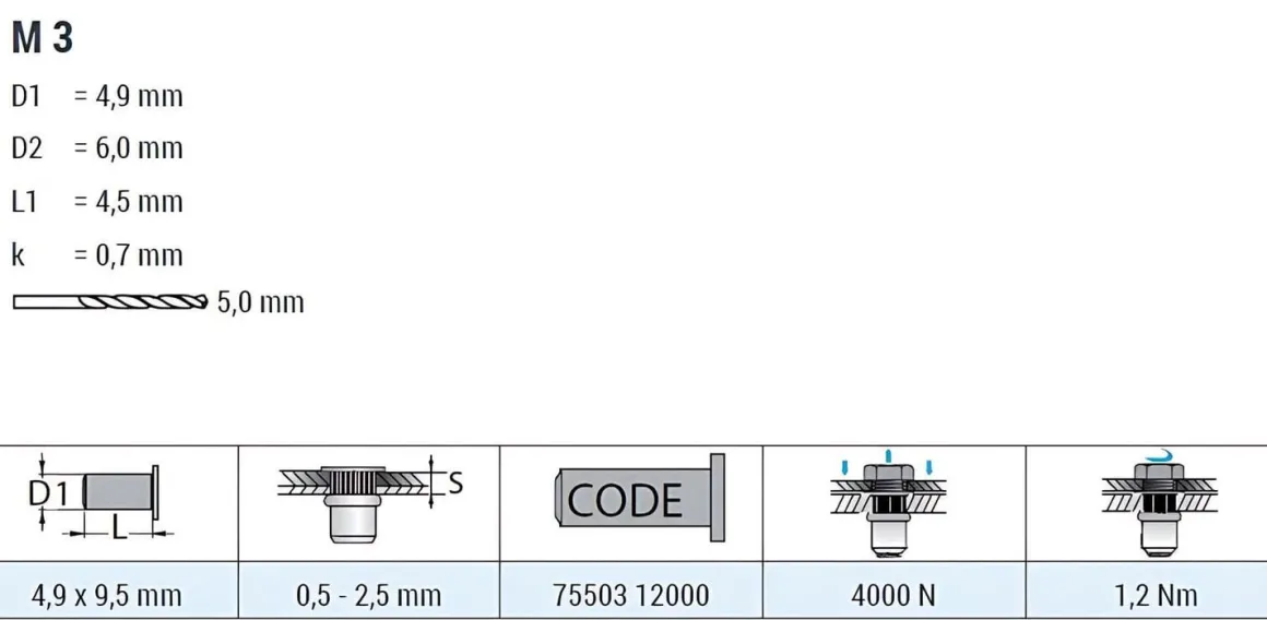 | Artikel | Blindnietmuttern BM /A2 /klSk /M3 /RsGer /Of GO–NUT Klemmbereich: 0,5 – 2,5 mm – Einziehmutter, Einnietmuttern |