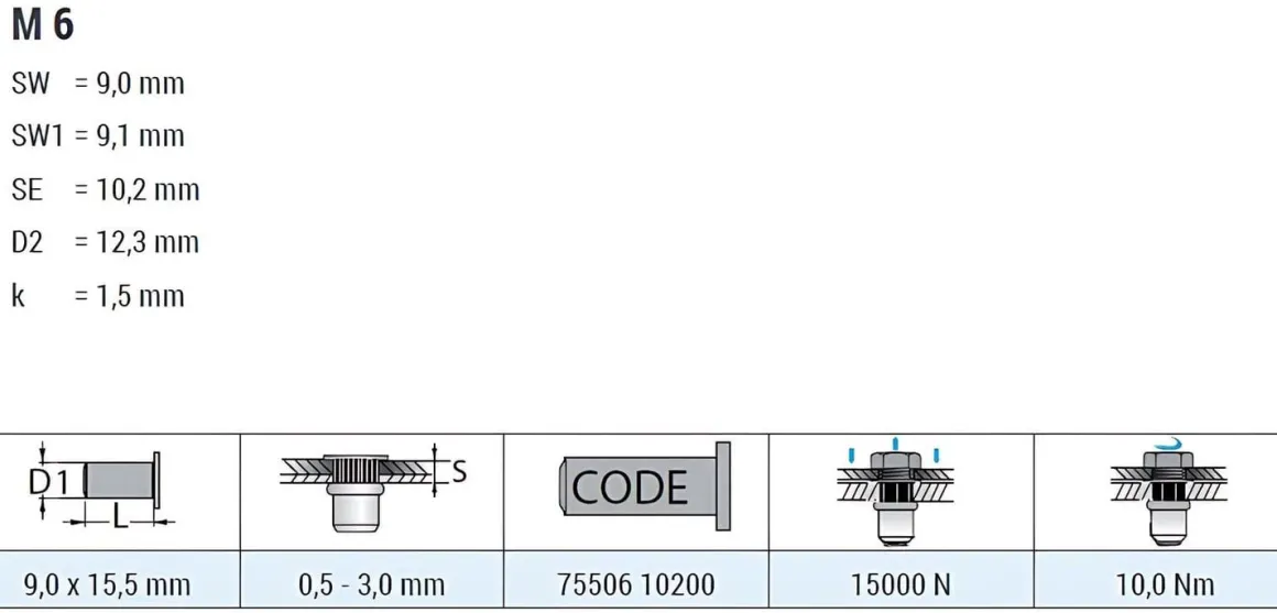 | Artikel | Blindnietmuttern BM /A2 /Fk /M6 /T6ks /Of GO–NUT Klemmbereich: 0,5 – 3,0 mm Einziehmutter Einnietmuttern |