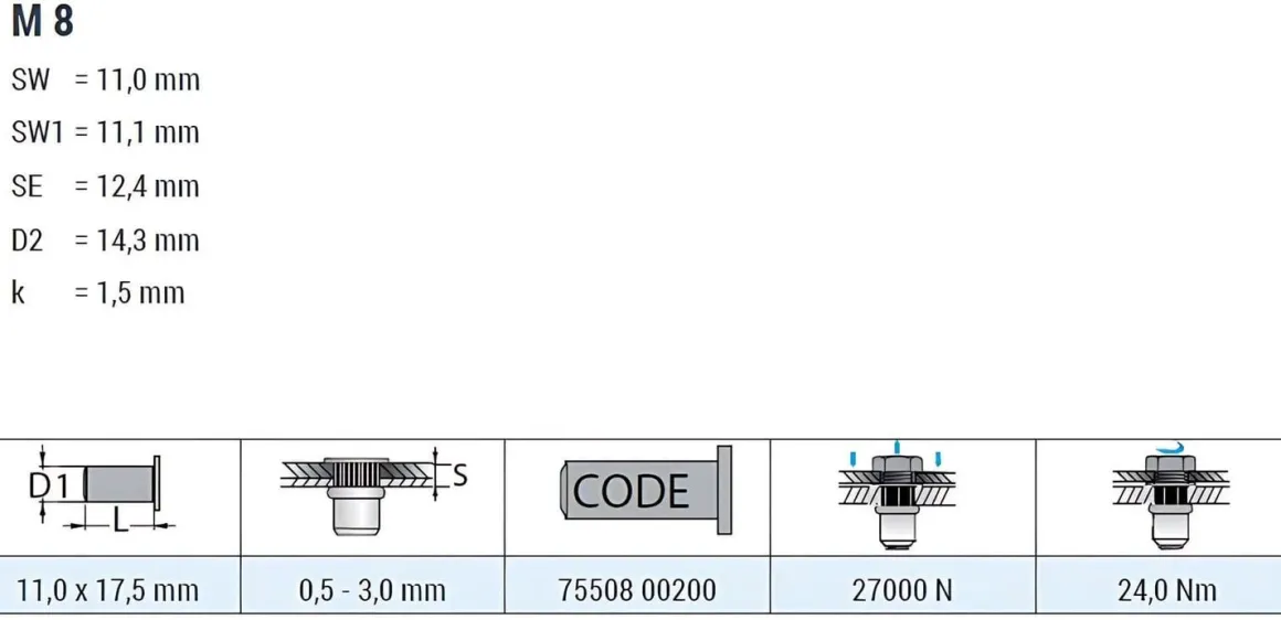 | Artikel | Blindnietmuttern BM /ST /Fk /M8 /T6ks /Of GO–NUT Klemmbereich: 0,5 – 3,0 mm Einziehmutter Einnietmuttern |