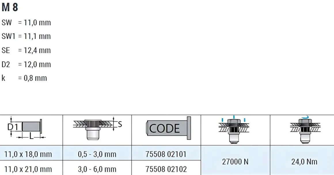 | Artikel | Blindnietmuttern BM /ST /klSk /M8 /6ks /Of GO–NUT Klemmbereich: 0,5 – 3,0 mm Einziehmutter Einnietmuttern |