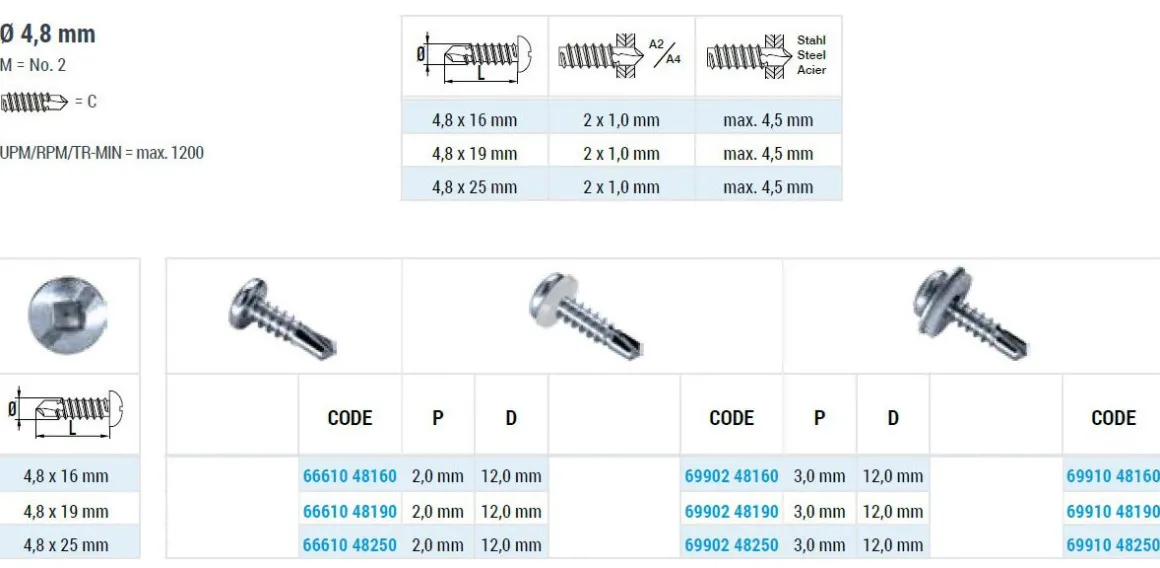 | Artikel | DIN 7504 SQ Linsenkopf–Bohrschrauben mit Dichtscheibe (SQ) A2 GL R12 4,8x16 mm inkl. SQ Bit 50mm |