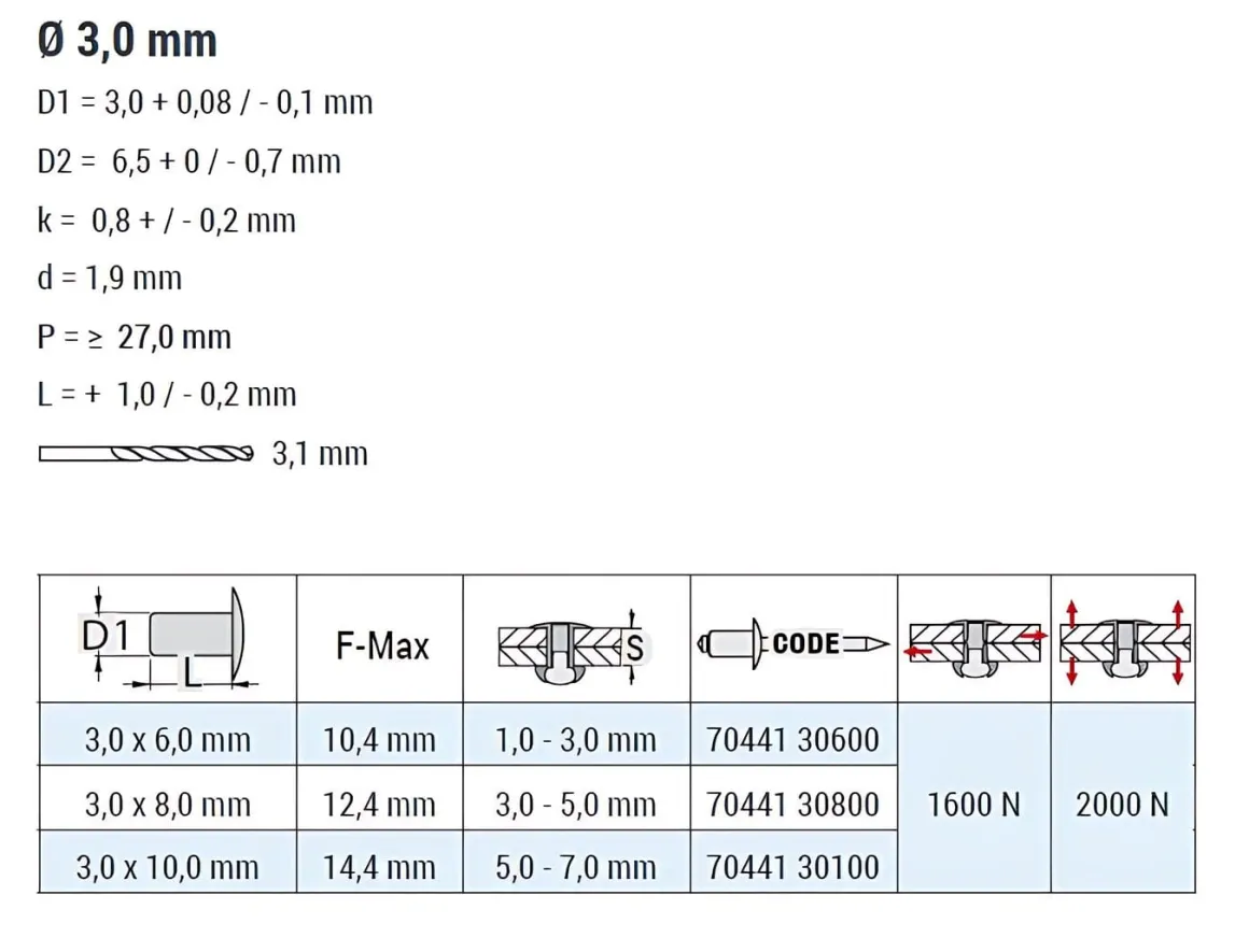 | Artikel | Blindniete STANDARD A4/A4 – Flachkopf – 3,0x8 mm |