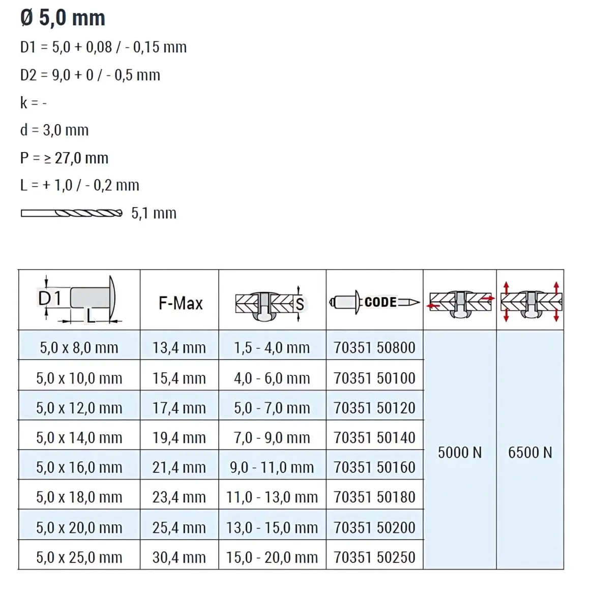 | Artikel | Blindniete STANDARD A2/A2 – Senkkopf – 5,0x12 mm |