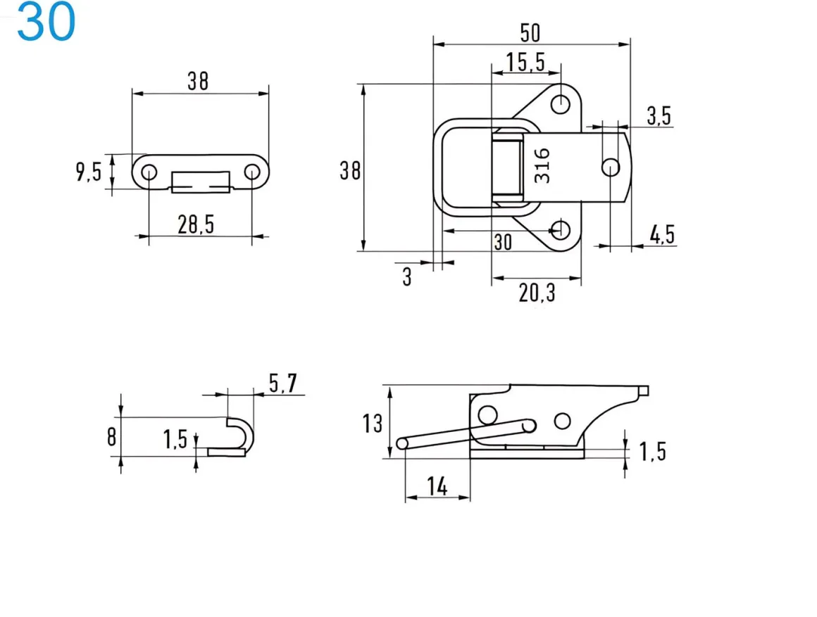 Spannverschluss Edelstahl A4 30 kleines Kappenschloss mit gerader Grundtplatte und Gegenhaken – Kistenverschluss – Kofferverschluss – Hebel Verschluss