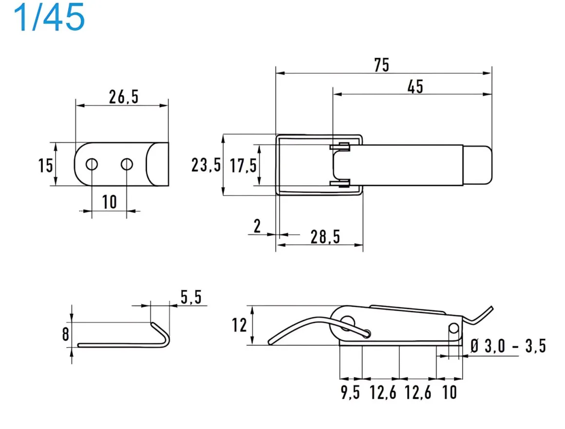 | Artikel | Spannverschlüsse K. Schloß verz. 1/45 – selbstschließend Nietloch 3,3 mm – 3 Löcher in Grundplatte |