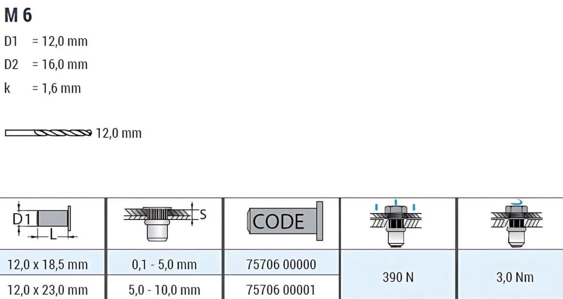 | Artikel | Spreizblindnietmuttern BM /ST /M6 /Fk /Of GO–FOUR Klemmbereich: 5,0 – 10,0 mm Einziehmutter Einnietmuttern |
