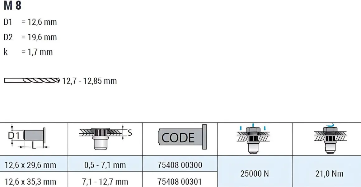 | Artikel | Spreizblindnietmuttern BM /ST /M8 /Fk /Rs /Of GO–SPLIT Klemmbereich: 7,1 – 12,7 mm Einziehmutter Einnietmuttern |