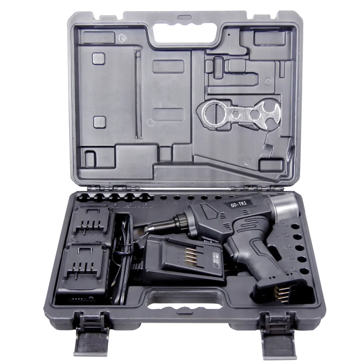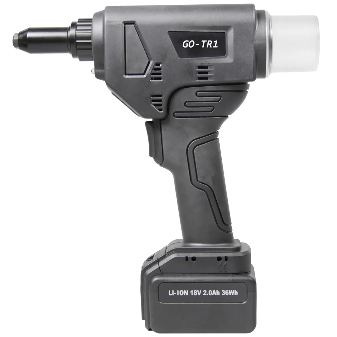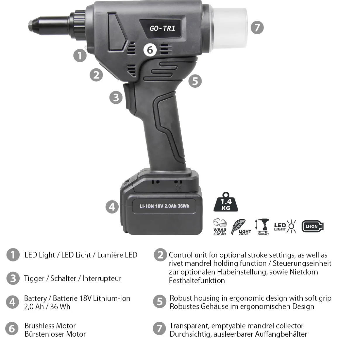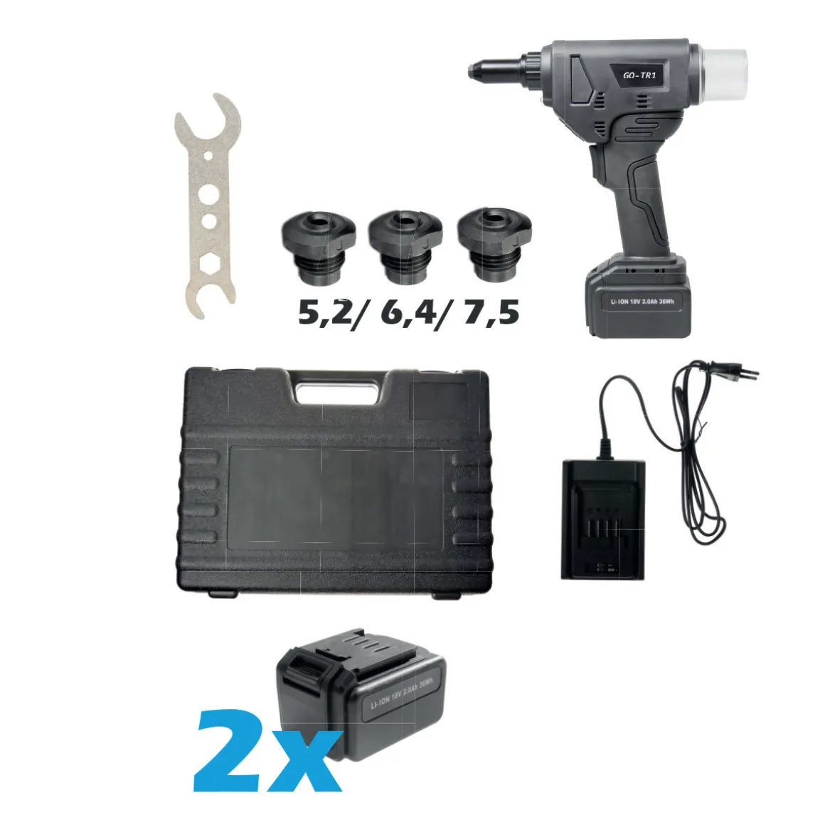 Akku Nieter Blindnietgerät | Nietgerät | GO-TR1 Presslaschen Blindnieten Setzwerkzeug mit bürstenlosem Motor 18V inkl. 2 Akku, Koffer und Zubehör Arbeitsbereich für Preßlaschen-Blindniete ø 5,2 / 6,4 / 7,5 mm Aluminium
