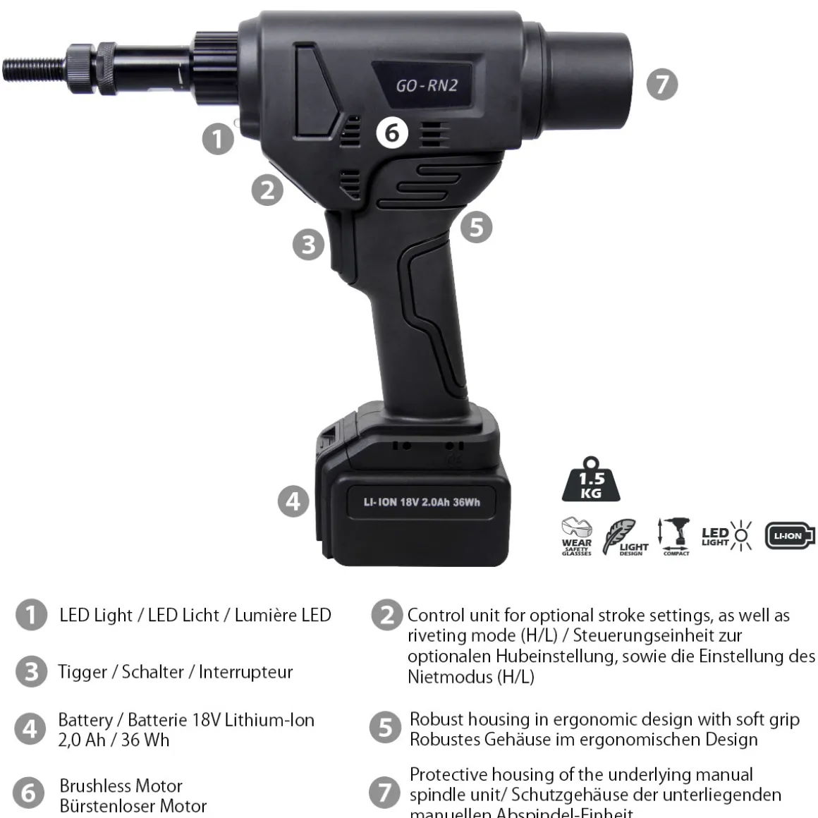 Akku-Tool GO-RN2 Akku Blindnietmuttern- & Schrauben Setzwerkzeug mit bürstemlosem Motor 18V ohne Akku, inkl. Koffer und Zubehör mit Arbeitsbereich M8 – M10 mm alle Materialien, M8 – M12 Aluminium und Stahl