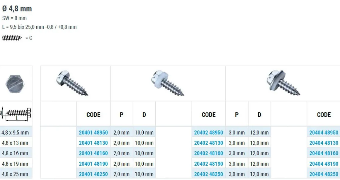 | Artikel | DIN 7976 – ISO 1479 Sechskant–Blechschrauben A2 C GL PA 4,8x16 mm |