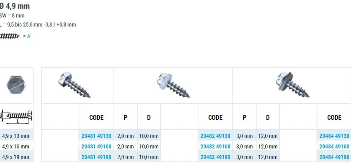 | Artikel | DIN 7976 – ISO 1479 Sechskant–Blechschrauben A2 A GL PA 4,9x13 mm |
