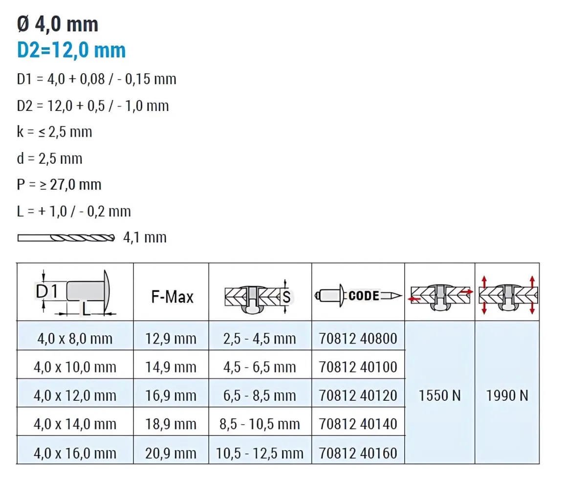 | Artikel | Blindniete STANDARD ST/ST – Großkopf K12 – 4,0x10 mm |