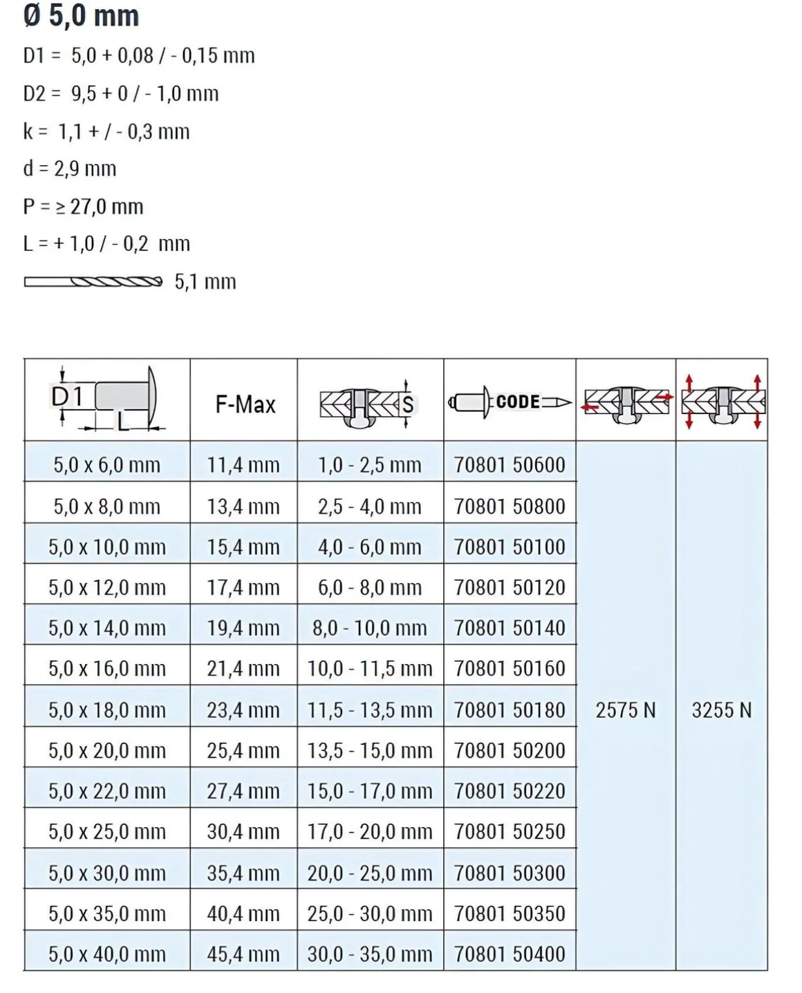 | Artikel | Blindniete STANDARD ST/ST – Flachkopf – 5,0x12 mm |