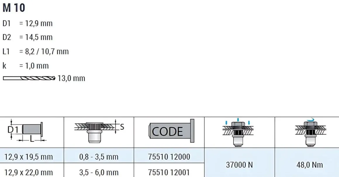 | Artikel | Blindnietmuttern BM /A2 /klSk /M10 /RsGer /Of GO–NUT Klemmbereich: 0,8 – 3,5 mm Einziehmutter Einnietmuttern |