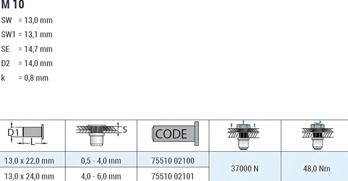 | Artikel | Blindnietmuttern BM /ST /klSk /M10 /6ks /Of GO–NUT Klemmbereich: 0,5 – 4,0 mm Einziehmutter Einnietmuttern |