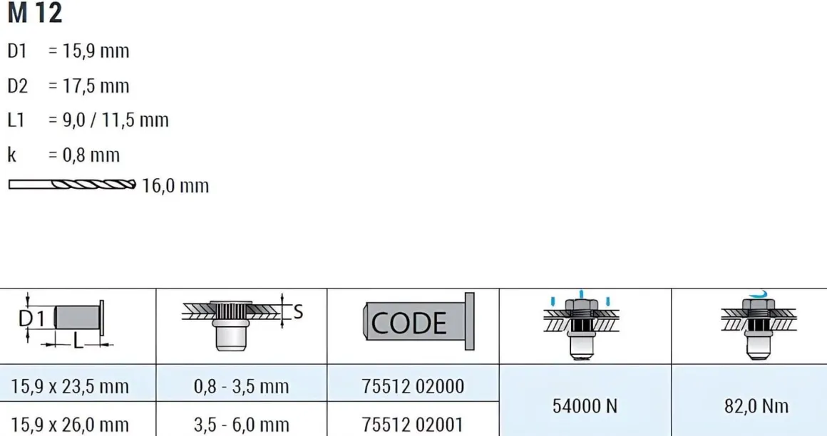 | Artikel | Blindnietmuttern BM /ST /klSk /M12 /RsGer /Of GO–NUT Klemmbereich: 3,5 – 6,0 mm Einziehmutter Einnietmuttern |