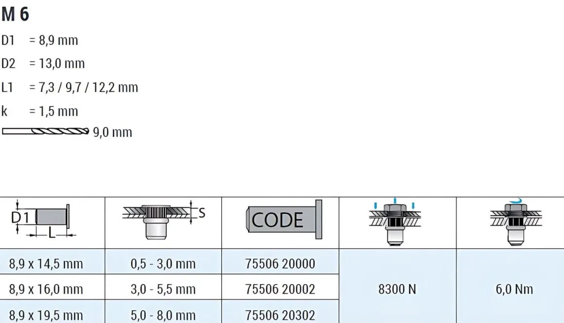 | Artikel | Blindnietmuttern BM /ALU /Fk /M6 /RsGer /Of GO–NUT Klemmbereich: 0,5 – 3,0 mm Einziehmutter Einnietmuttern |