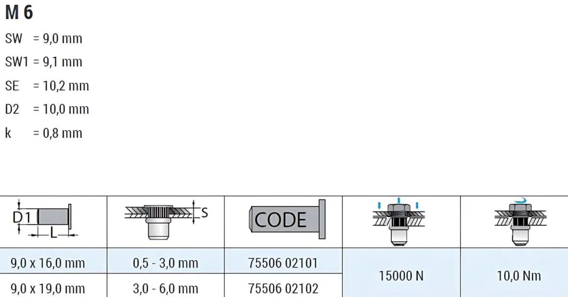 | Artikel | Blindnietmuttern BM /ST /klSk /M6 /6ks /Of GO–NUT Klemmbereich: 0,5 – 3,0 mm Einziehmutter Einnietmuttern |
