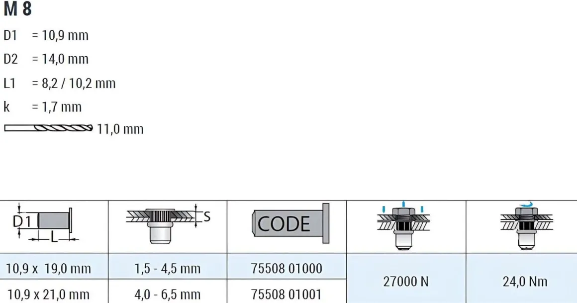 | Produkttyp | Blindnietmuttern, Einziehmutter, Einnietmuttern |