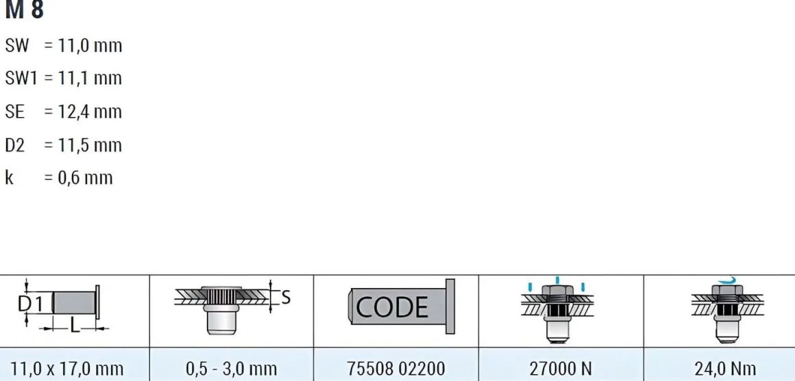 | Artikel | Blindnietmuttern BM /ST /klSk /M8 /T6ks /Of GO–NUT Klemmbereich: 0,5 – 3,0 mm Einziehmutter Einnietmuttern |