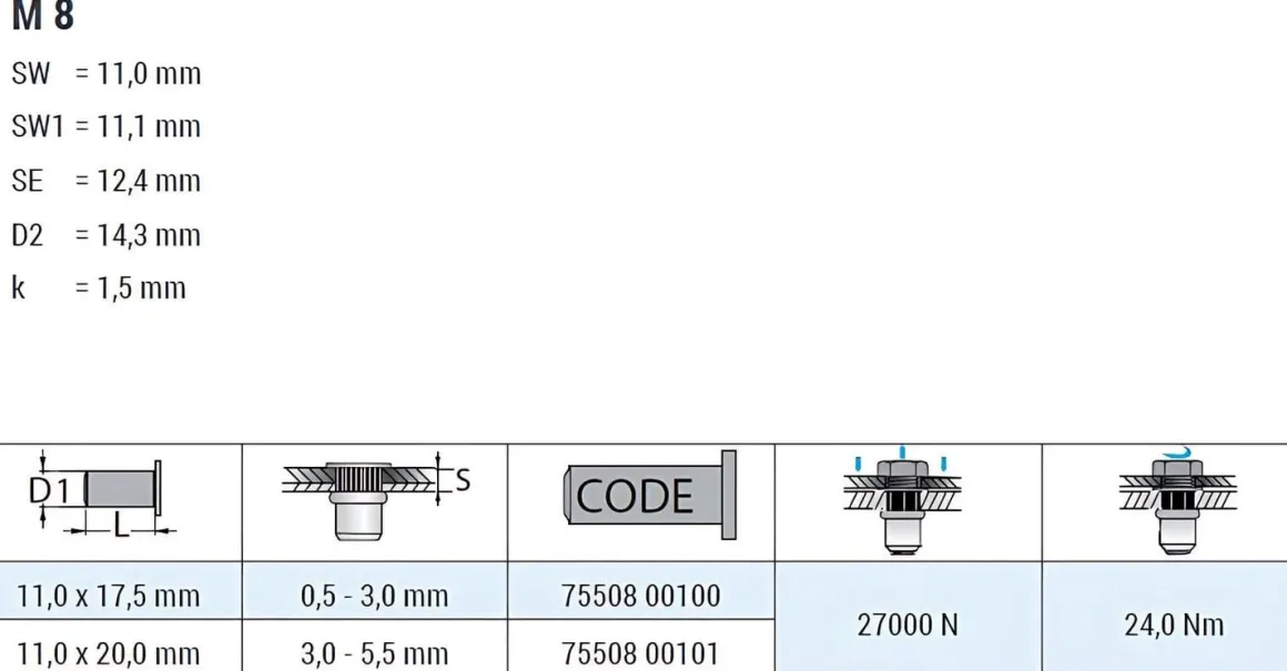 | Artikel | Blindnietmuttern BM /ST /Fk /M8 /6ks /Of GO–NUT Klemmbereich: 0,5 – 3,0 mm Einziehmutter Einnietmuttern |