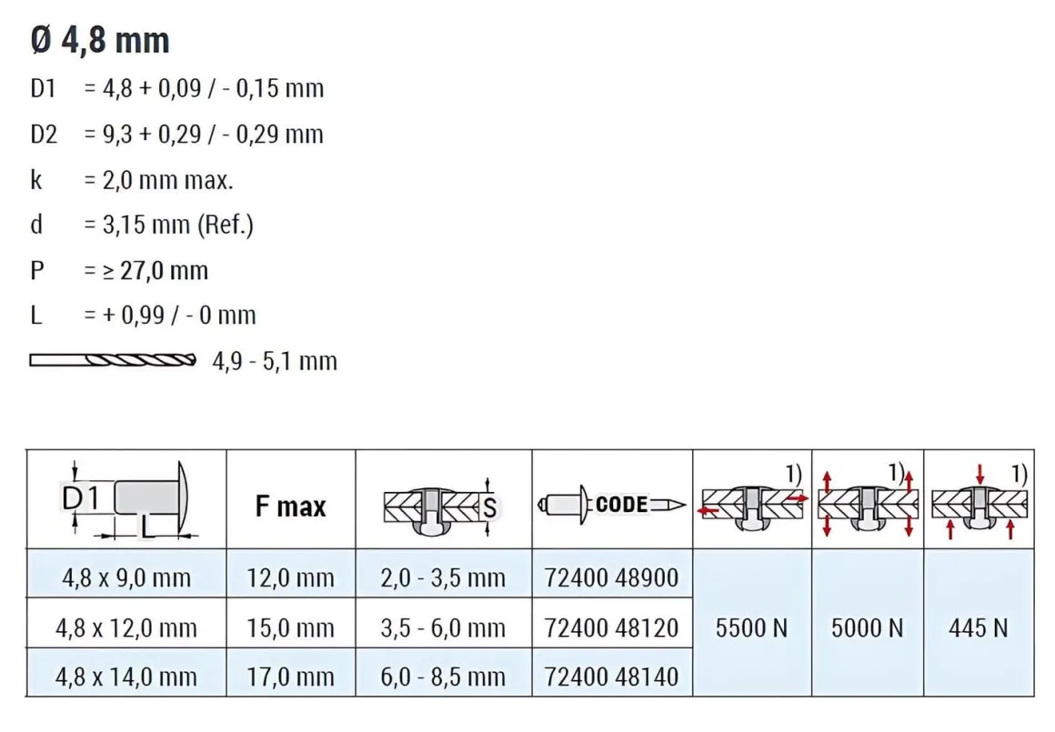 | Artikel | Hochfeste Blindniete GO–INOX mit wulstförmigen Schließkopf Hochfeste Blindniete GO–INOX II A2/A2 – Senkkopf – 4,8x12 mm |