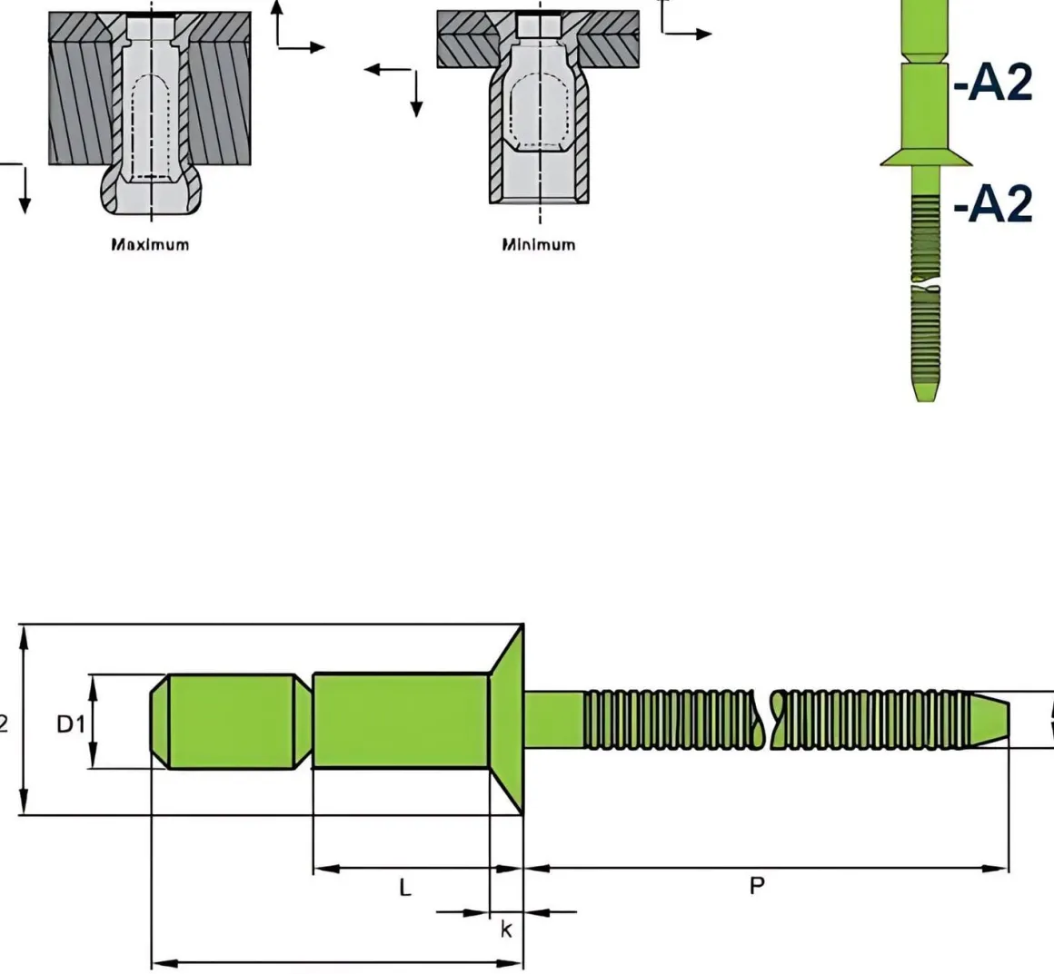 | Artikel | Hochfeste Blindniete GO–LOCK mit konusförmigen Schließkopf A2/A2 – Senkkopf – 6,4x23,5 mm |