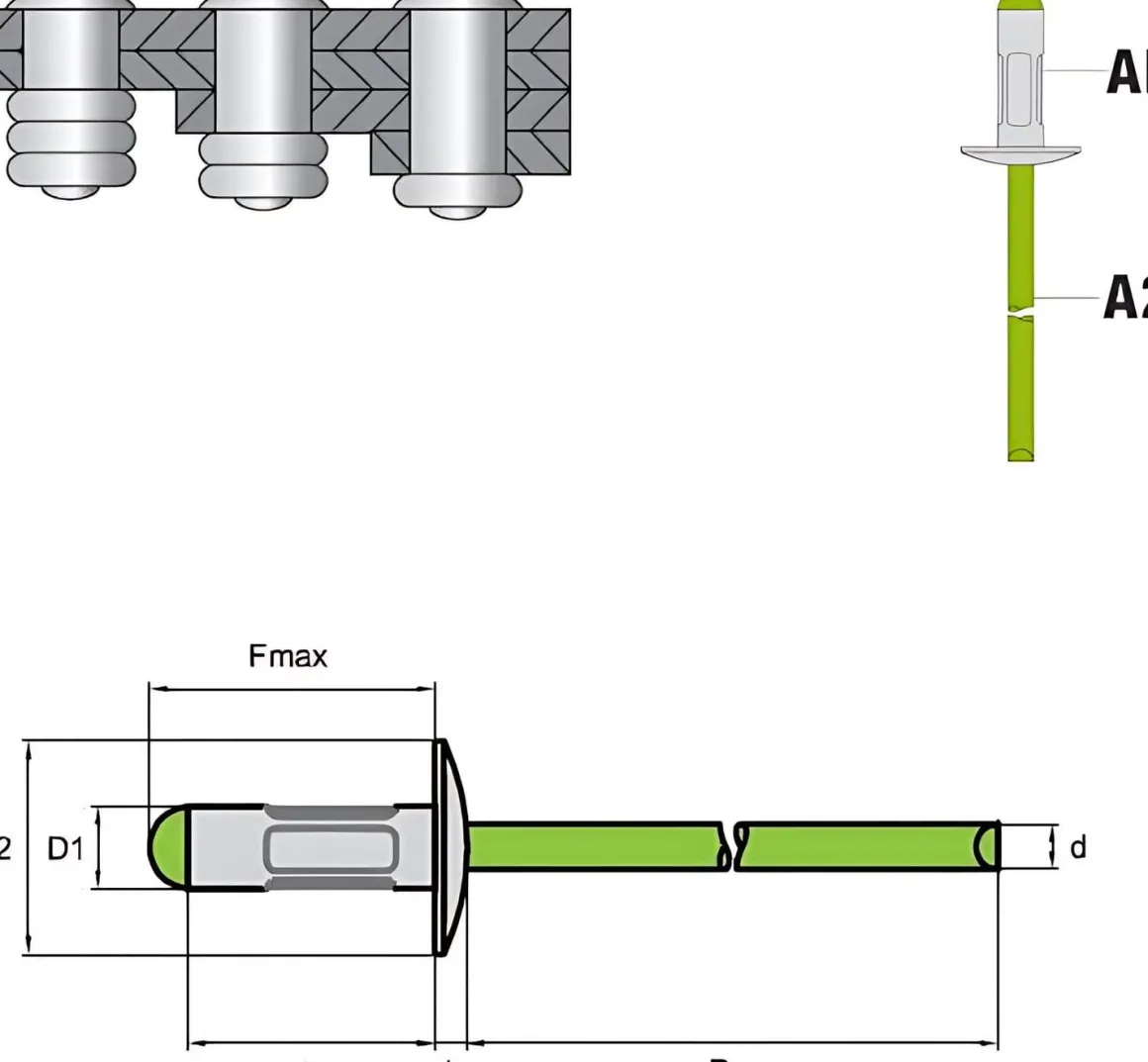 | Artikel | Mehrbereichs–Blindniete Mehrbereichsblindniete MULTI AL/A2 – Großkopf K16 – 4,8x16,9 mm |