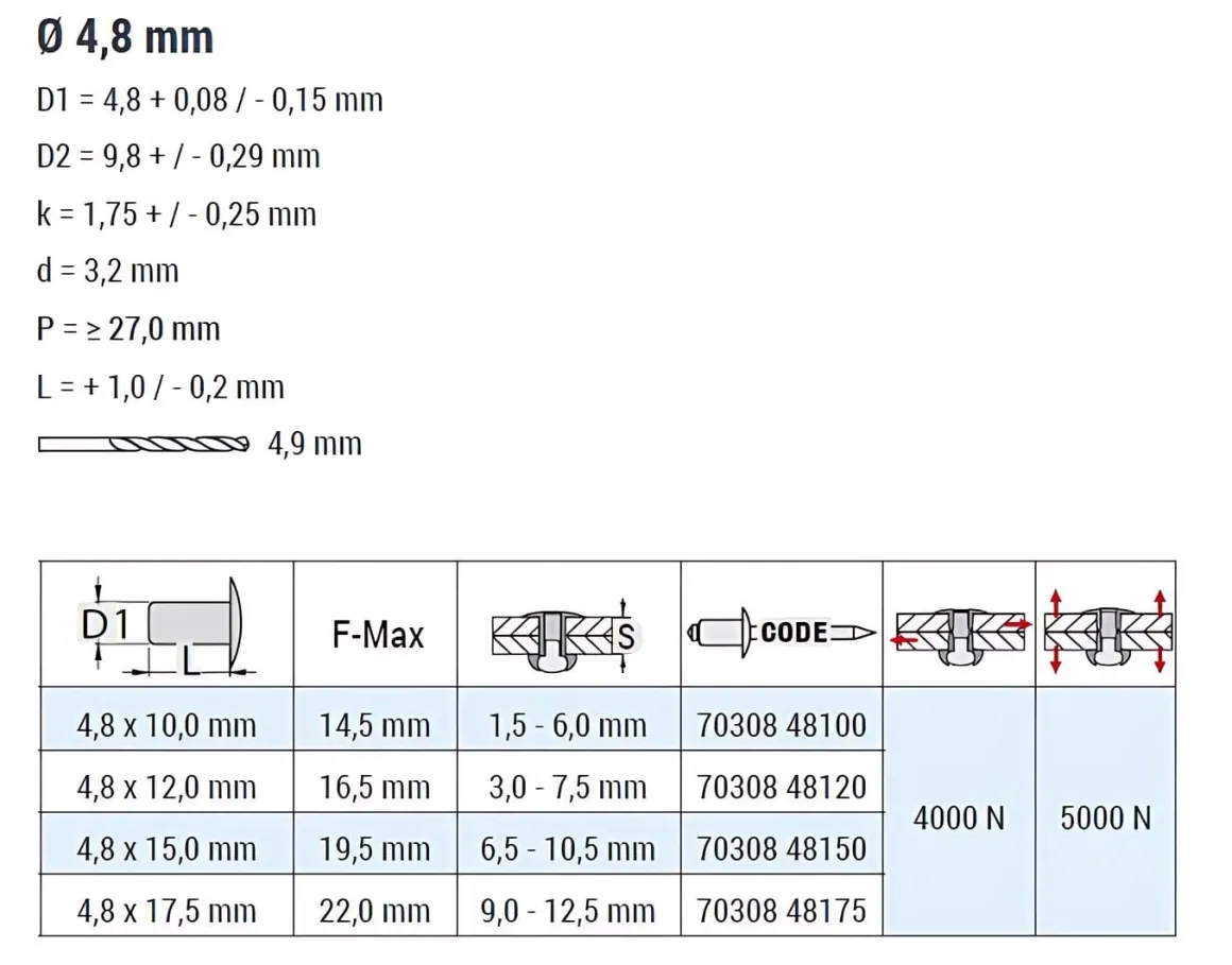 | Artikel | Mehrbereichs–Blindniete Mehrbereichsblindniete MULTI A2/A2 – Flachkopf – 4,8x10 mm |