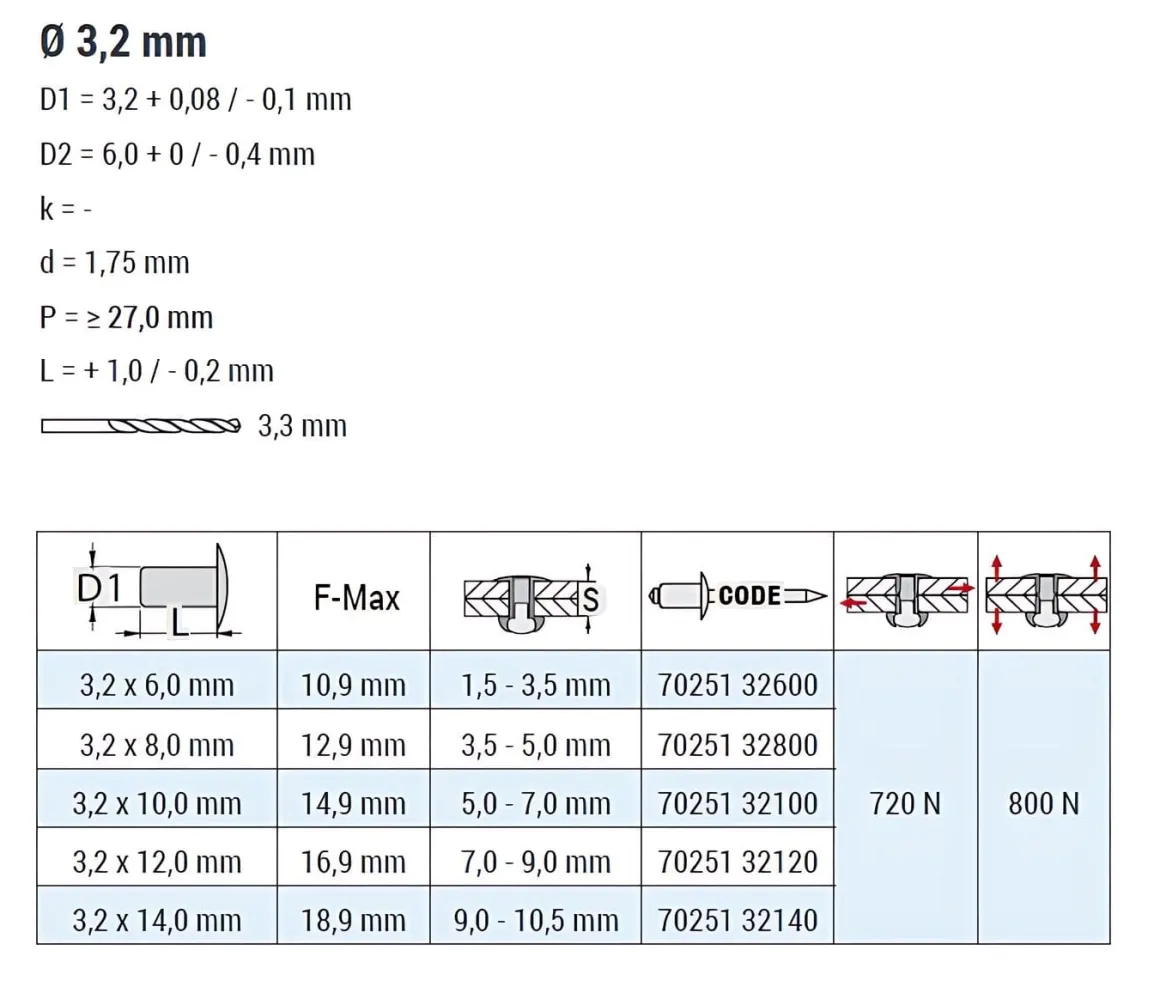 | Artikel | Blindniete STANDARD AL/A2 – Senkkopf – 3,2x6 mm |