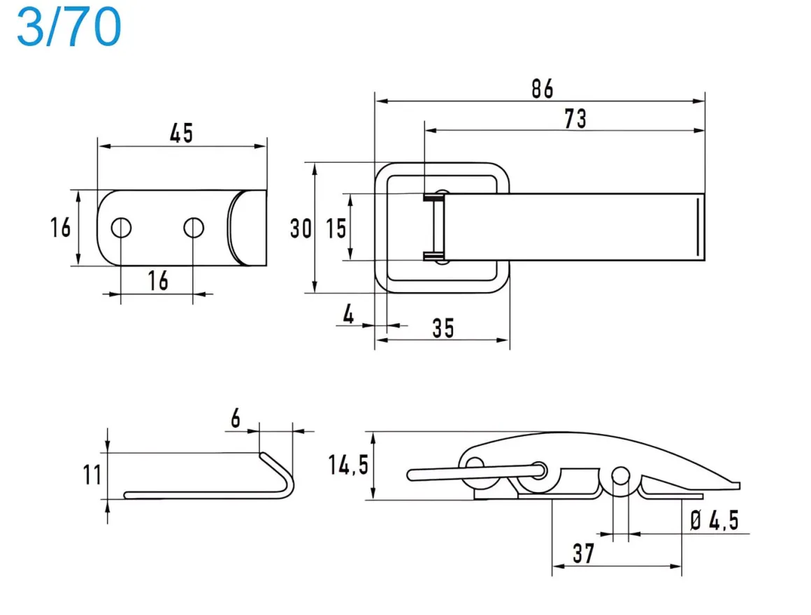 | Artikel | Spannverschlüsse K. Schloß Aluminium 3/70 Nietloch 3,5 mm |