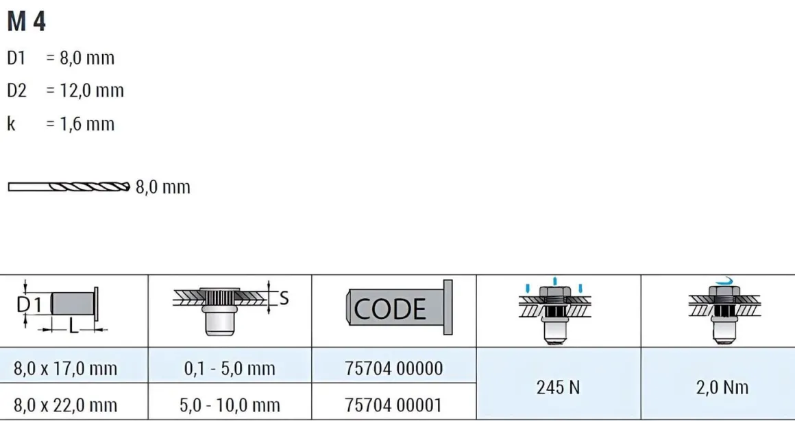 | Artikel | Spreizblindnietmuttern BM /ST /M4 /Fk /Of GO–FOUR Klemmbereich: 0,1 – 5,0 mm Einziehmutter Einnietmuttern |